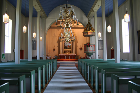 Fil:Gjerstad kyrkje, Osterøy Kirkerom fremre.jpg